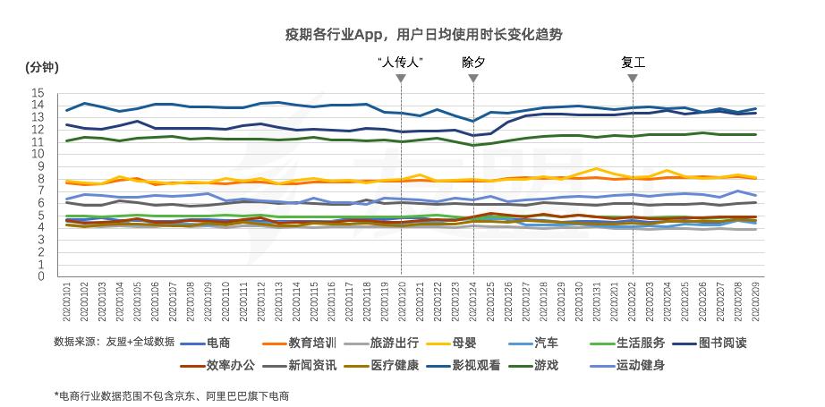 自疫期及假期开始走低。其中汽车类及旅游出行受到的影响较大,使用时长明显降低。