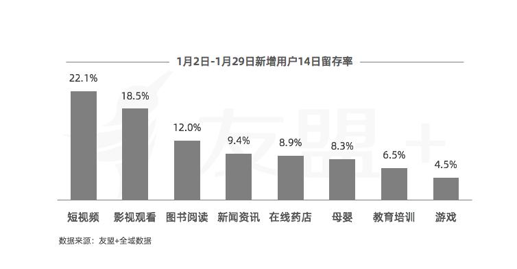 7、疫期快速发展的线上药店、教育培训、母婴、游戏,14日留存率表现相对较差;