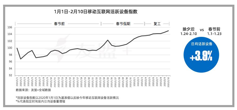 2020年1月至2月春节假期前后,中国地区活跃设备量稳健提升