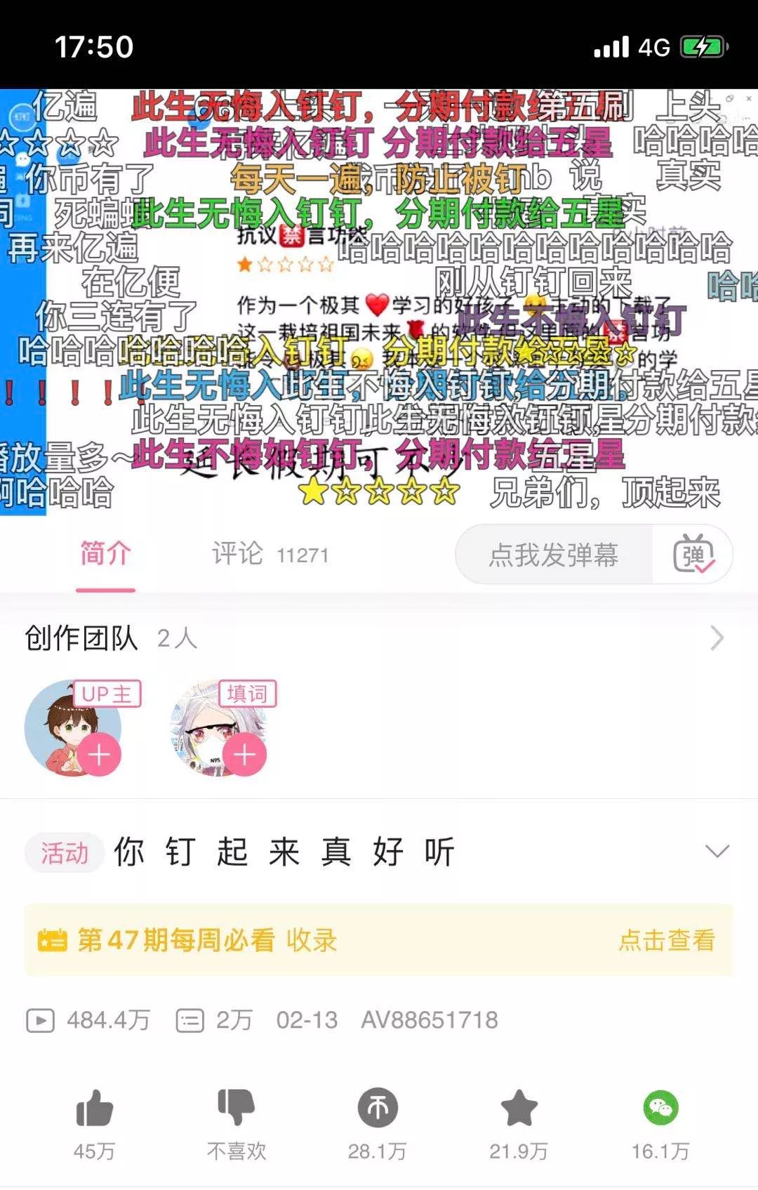 本来以为自己成功“求饶”了,没想到B站的up主,在2月13日晚上8点半,发了一条吐槽视频《你钉起来真好听》,这个短视频以学生的视角,用熟悉的音乐,套上新词,“你钉起来真好听,特别像午夜凶铃……”