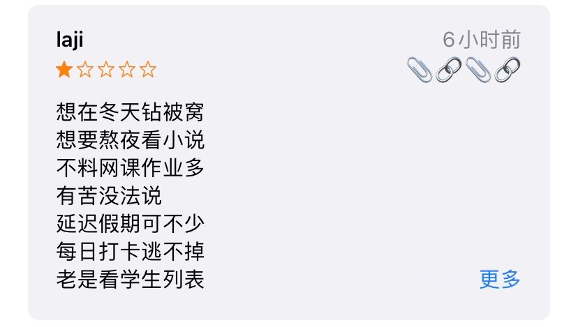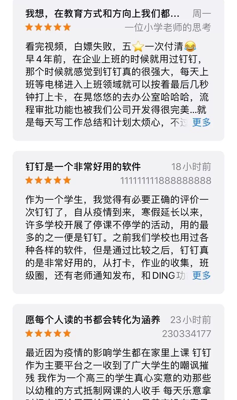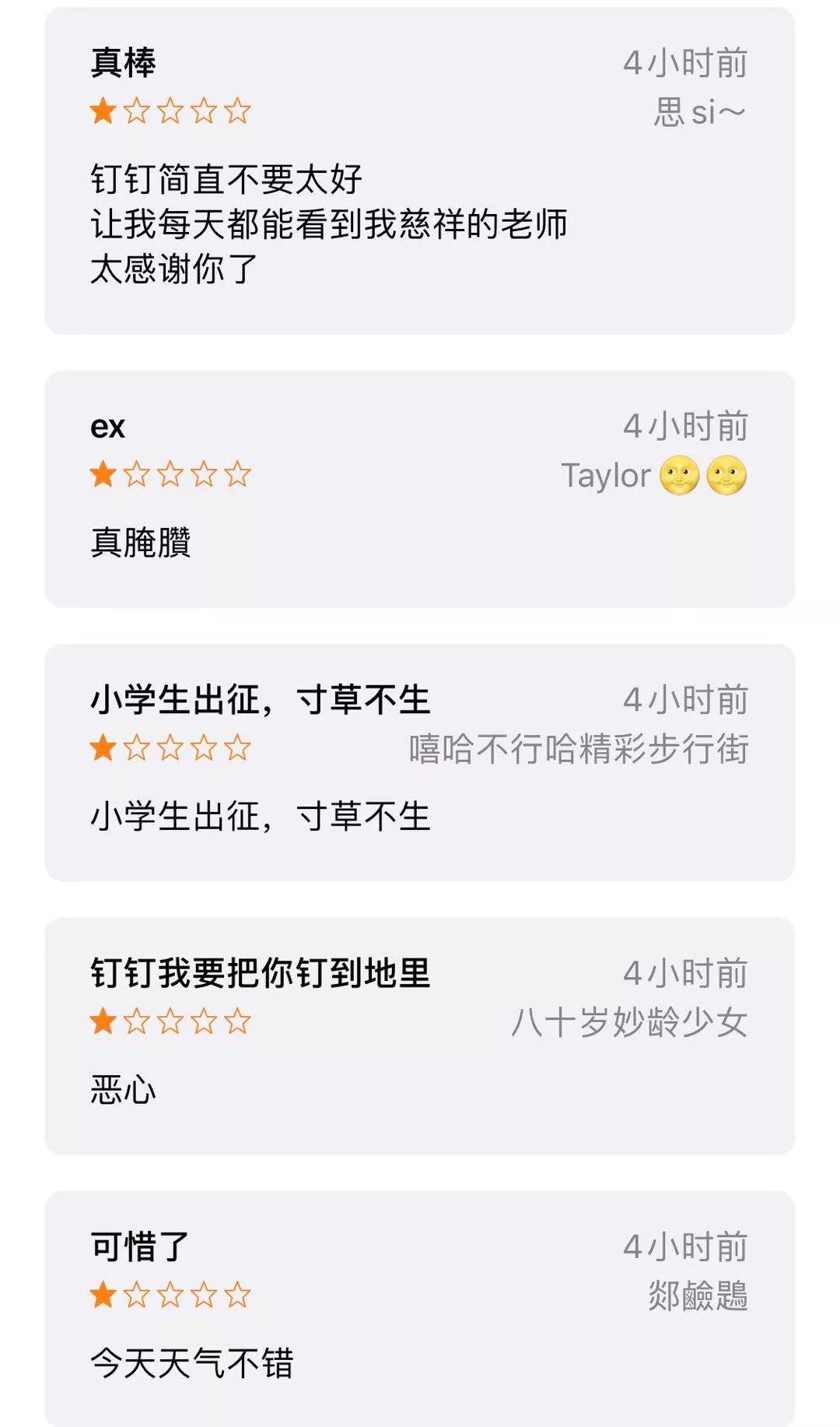 熟练运用手机的小学生们开始调皮了,开始“攻陷” appstore的评分区域,疯狂给钉钉送出一星“好评”,并且附上搞笑的文案,比如: