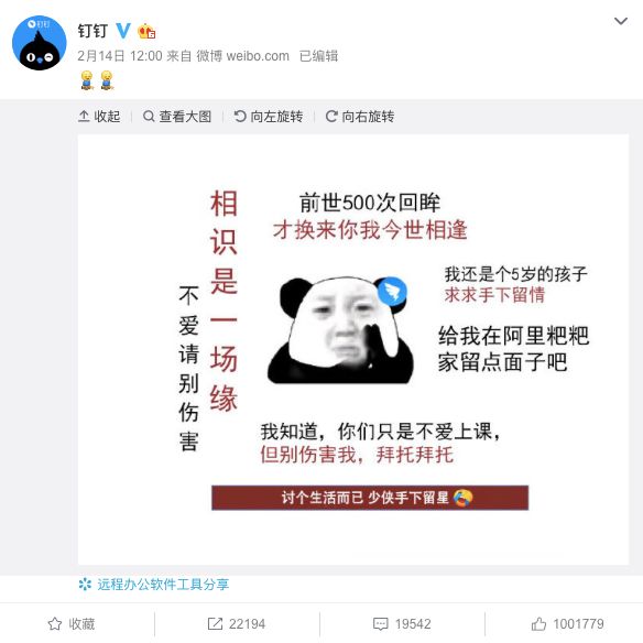 2月15日,钉钉官方微博自己转发,并调侃。实际上,大叔估计,此事,钉钉公关团队已经决定要做一个视频回应回去,但策略不是硬怼,而是继续“求饶”。