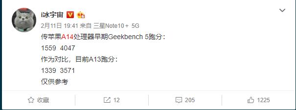 国内知名数码博主@i冰宇宙不久前也在微博上曝光称,苹果A14芯片的跑分为单核1559 、多核4047,相比A13有比较大幅度的提升。