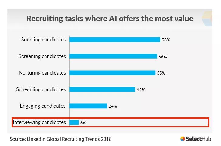 领英发布的报告指出,寻找和筛选候选人是AI价值最高的环节,AI在面试上价值还不高