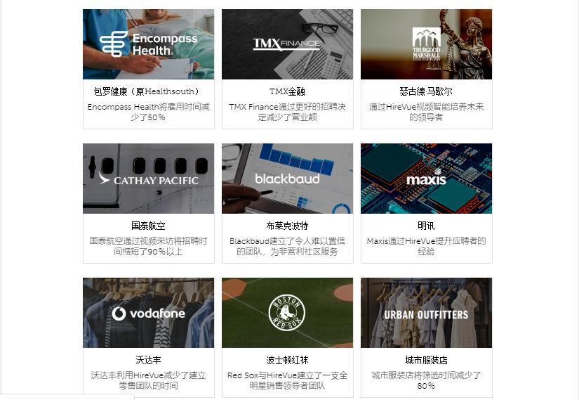 HireVue的客户案例显示面试产品多用在服务业中销售、客服等岗位,图源:HireVue官网