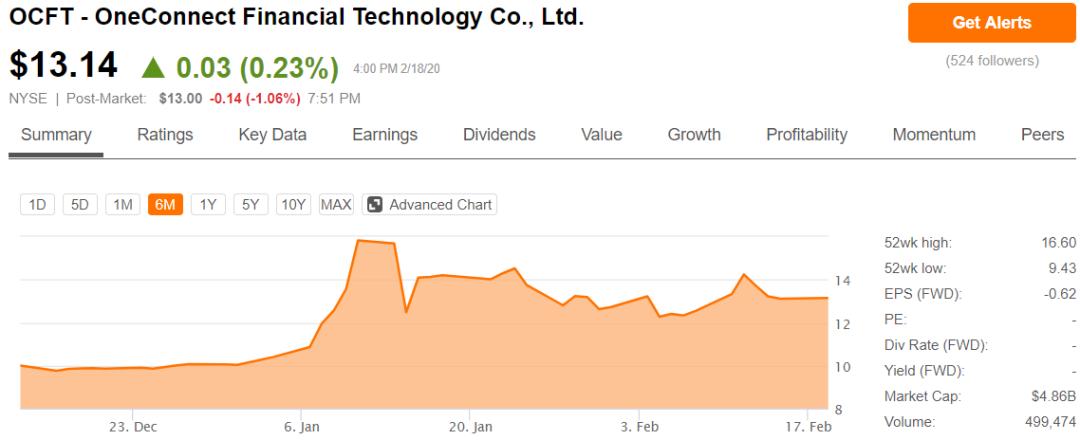 金融壹账通自上市以来,股价经历了一轮快速上涨,一度涨幅接近60%;而进入2月以来逐渐回调,目前稳定在13美元/股上下,但较发行价10美元涨幅仍然超过30%。