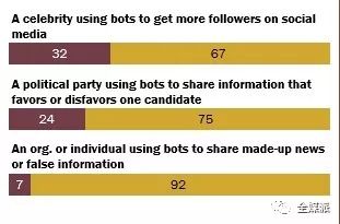 大概有2/3的美国人听说过社交媒体机器人帐号(social media bot),其中大多数人认为它们存在被恶意使用的情况。在听说过社交媒体机器人的美国人中,67%的人反对名人利用“网络水军”来获取更多关注。而对于组织和个人利用“僵尸号”来发布编造的新闻和虚假信息的态度调查中,92%表示反对。