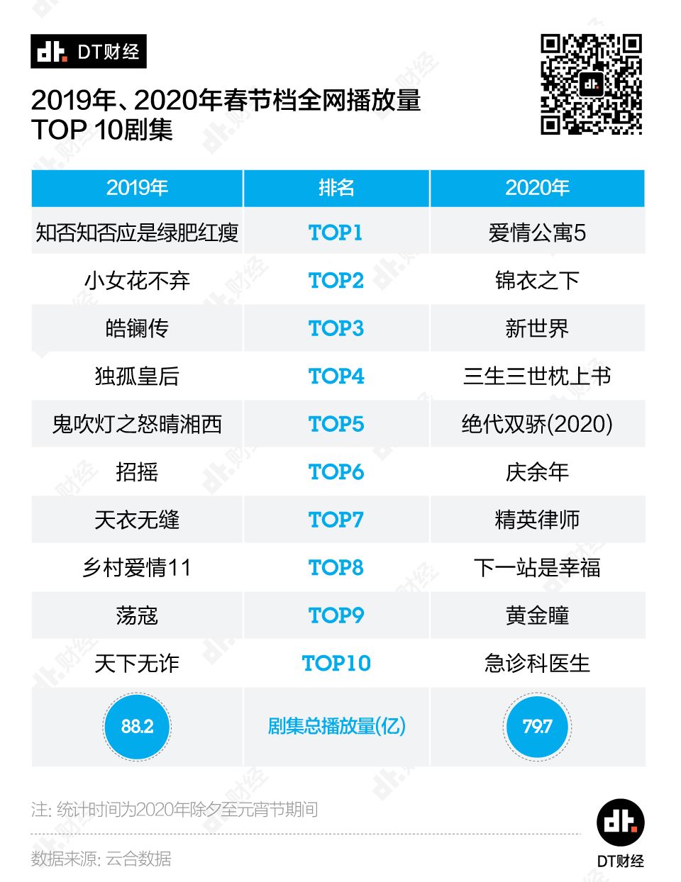 而且,我们还注意到,这段时间头部剧集的表现反而不如2019年。今年TOP10剧集的全网播放量为79.7亿,低于去年的88.2亿。
