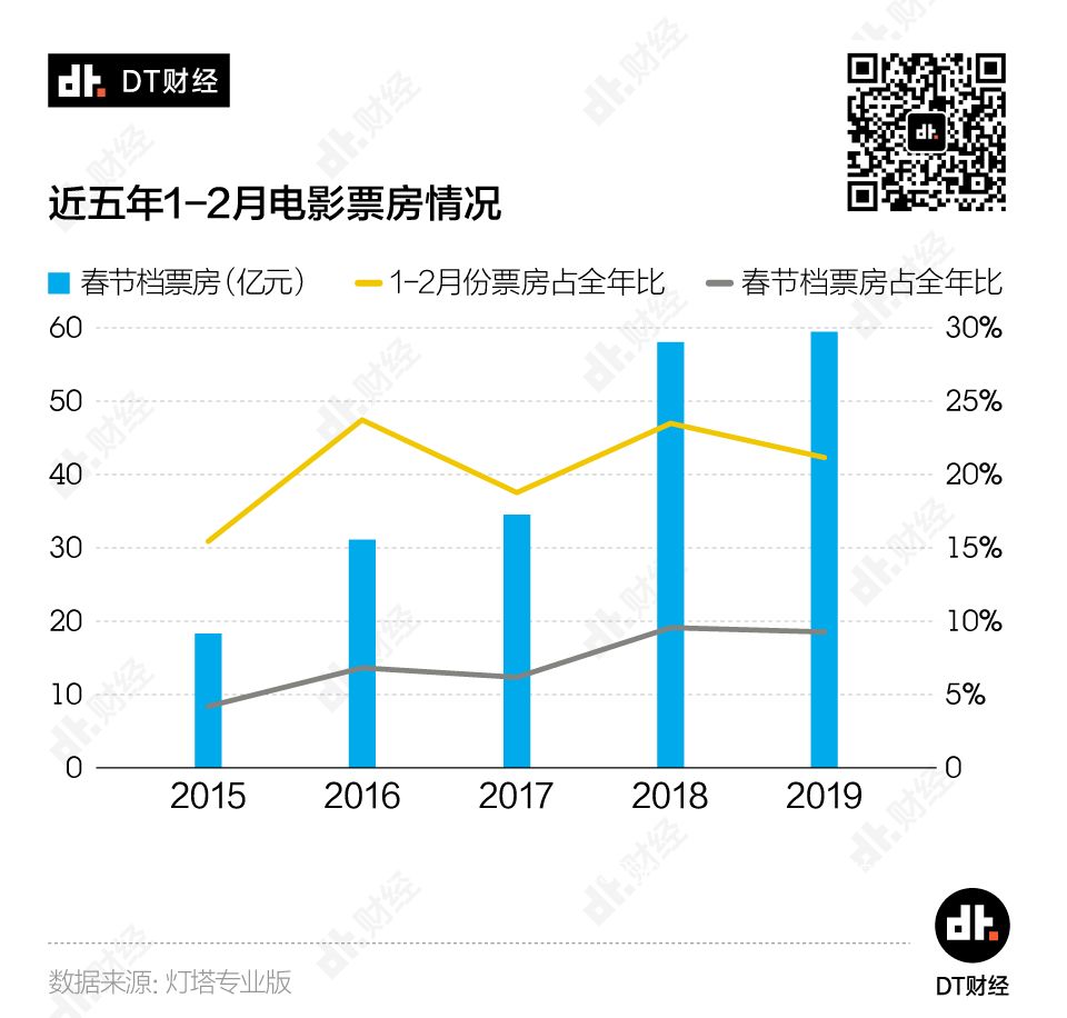 我们查看了过去五年的票房数据,春节档在近两年的占比颇高,短短7天便贡献了全年1/10的票房。从绝对数值来看,2019年的春节档票房已经达到59亿元。