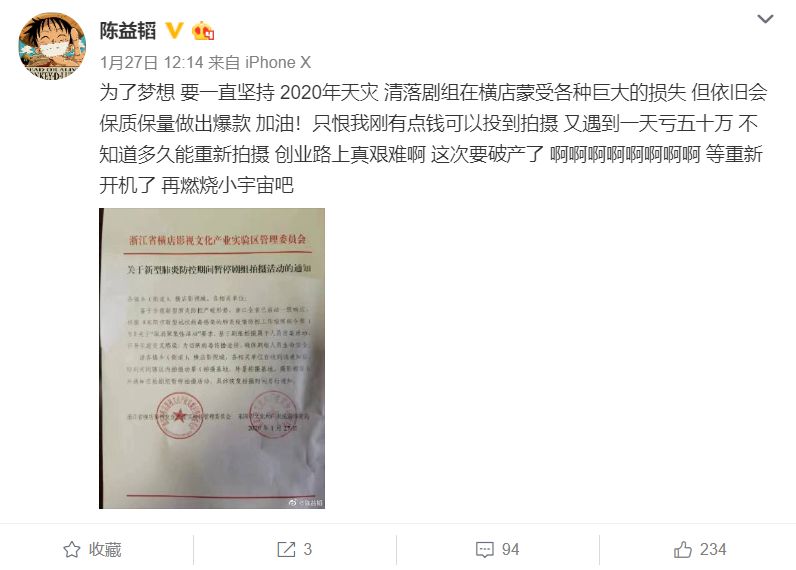 《清落》制片人陈益韬1月27日在微博上发声,直言停工使剧组蒙受巨大损失,一天要亏50万元。