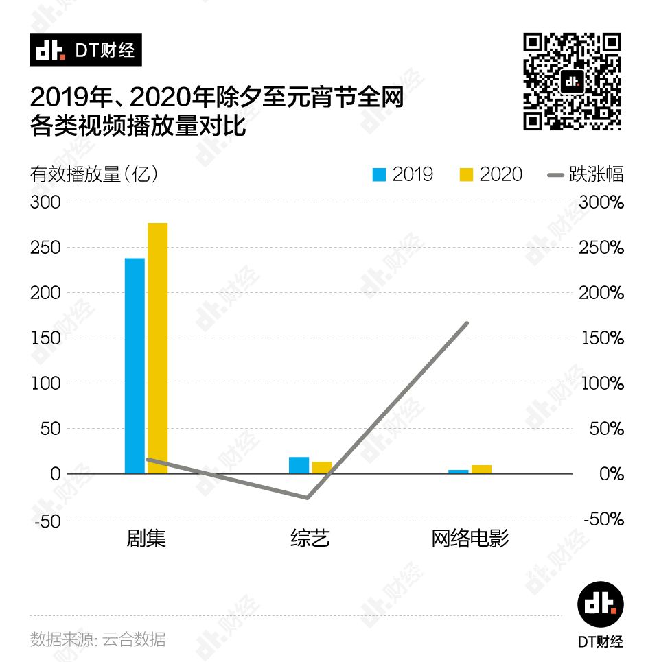 从除夕至元宵的这段时间,全平台剧集播放量达到277亿,同比增长了16.39%——与其他诸多互联网产品在这段时间的增量比起来,多少有些不起眼;而综艺更是因为疫情导致多档综艺节目停录,播放量下滑27.78%。