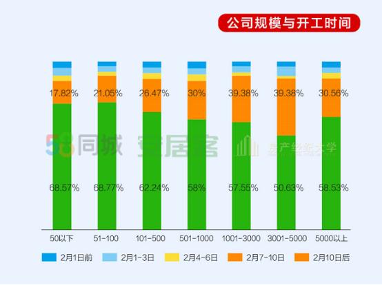 58安居客房产经纪大学调研数据显示,从复工房产经纪公司规模上看,100人以下小型经纪公司延迟开工的比例更高,达到近70%;3001-5000人的中型经纪公司在2月10日之前开工的占比达到近50%;5000人以上大型经纪公司2月10日后复工比例,高于中型经纪公司。可见,与小型经纪公司“船小好掉头”的灵活复工,及大型经纪公司“规模优势”的延期复工相比,中型经纪公司选择了更早开工。而中型经纪公司在疫情中面临的竞争、资金等压力或许更大,对于延迟开工的风险感知更为敏感。