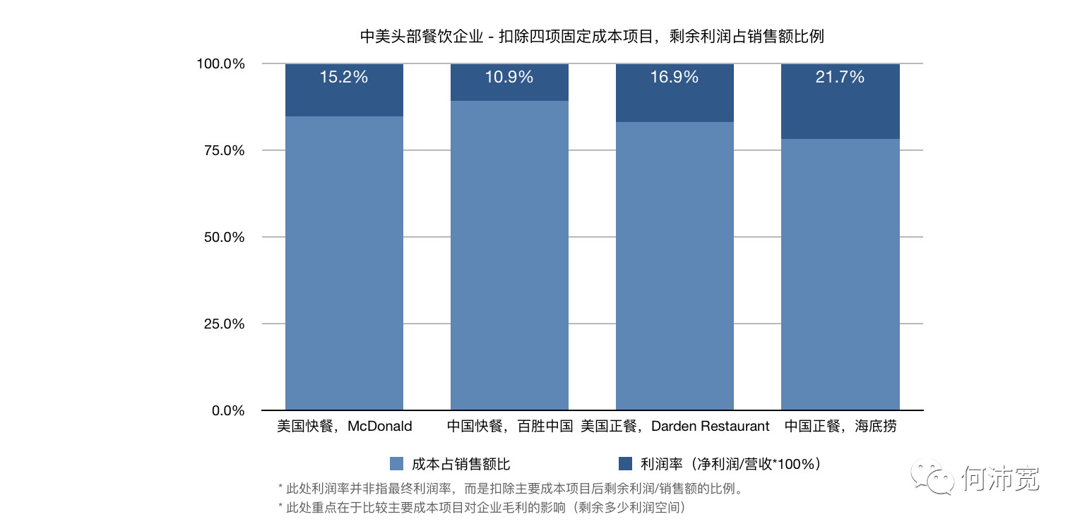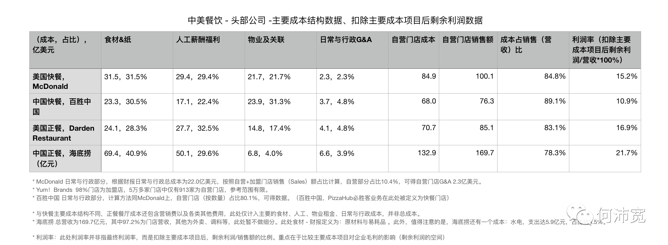 比如海底捞,基于其火锅生意的特征,水电成本占营收额可达3.5%,实际最终销售利润率(税后)约为7%(169.7亿元营收、利润11.9亿元)。在Darden Restaurant有额外的营销费用,该类成本占营收比在3%。