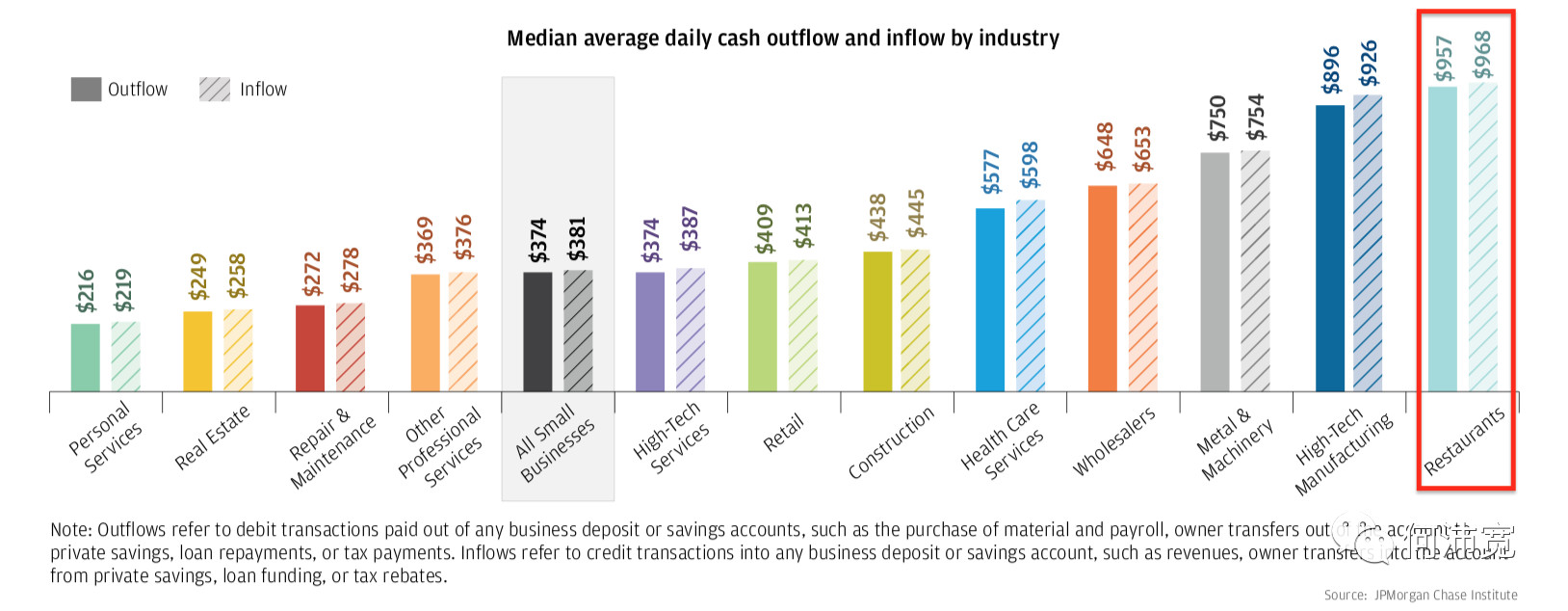 疫情下,不乏餐饮品牌现金流只能支撑三个月经营,这是国内市场环境下,餐饮企业经营脆弱的表现吗?不妨来看JPMorgan Chase在美国市场调研的数据:餐饮行业的现金流金额进出中位数(下见图),高于其他所有行业(部分原因在于餐饮行业食材、地租、人工服务等成本以及食物产品销售收入具备同步实时性)。