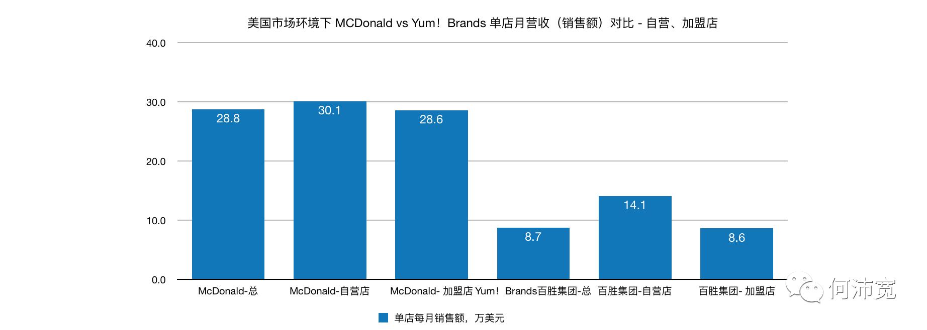 主要营收在美国(及欧洲)市场环境下McDonald 和 Yum!Brands百胜集团,前者无论是自营门店、还是加盟门店,月销售额都远高于后者(见下图)。这样的对比,可以看到,比如在国内,定位几乎一致(平价、快捷、卫生的)头部快餐品牌,单店营收能力也可能存在较大差距。
