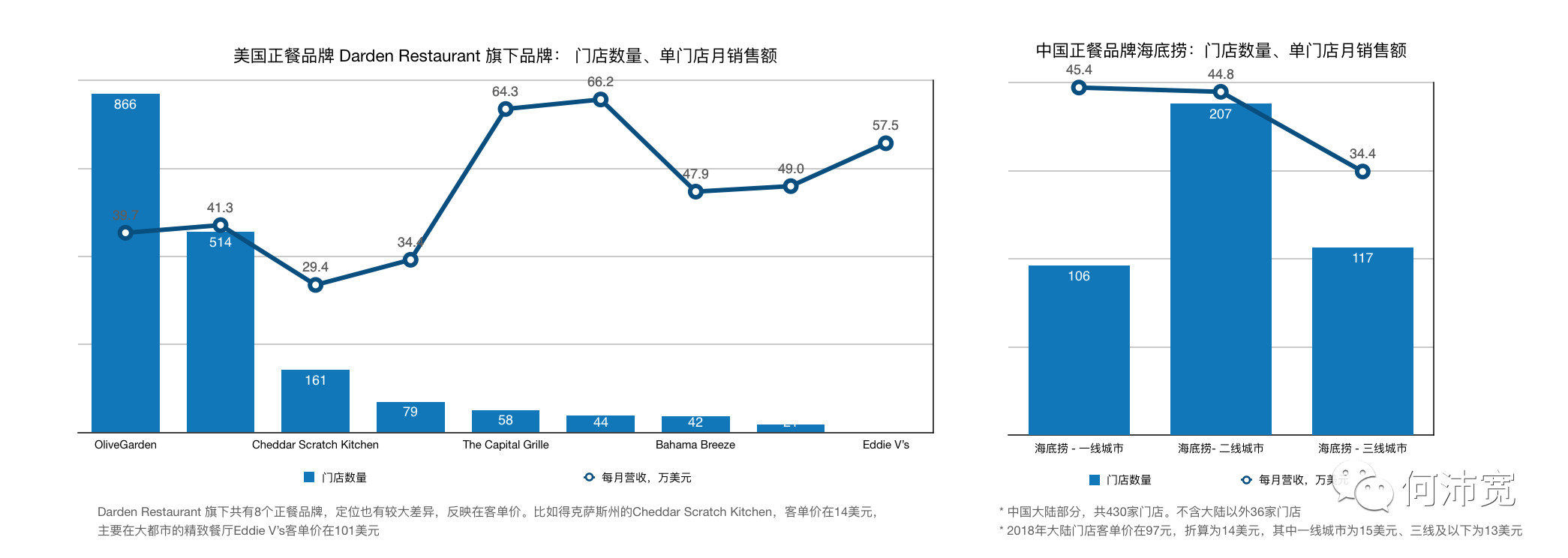 美国的Darden Restaurant旗下有8个子品牌,细分品牌单店月营收能力差异较大,在29万美元~66万美元之间。国内海底捞落地时,在一线、二线及三线以下城市的单店月营收在34~45万美元之间。