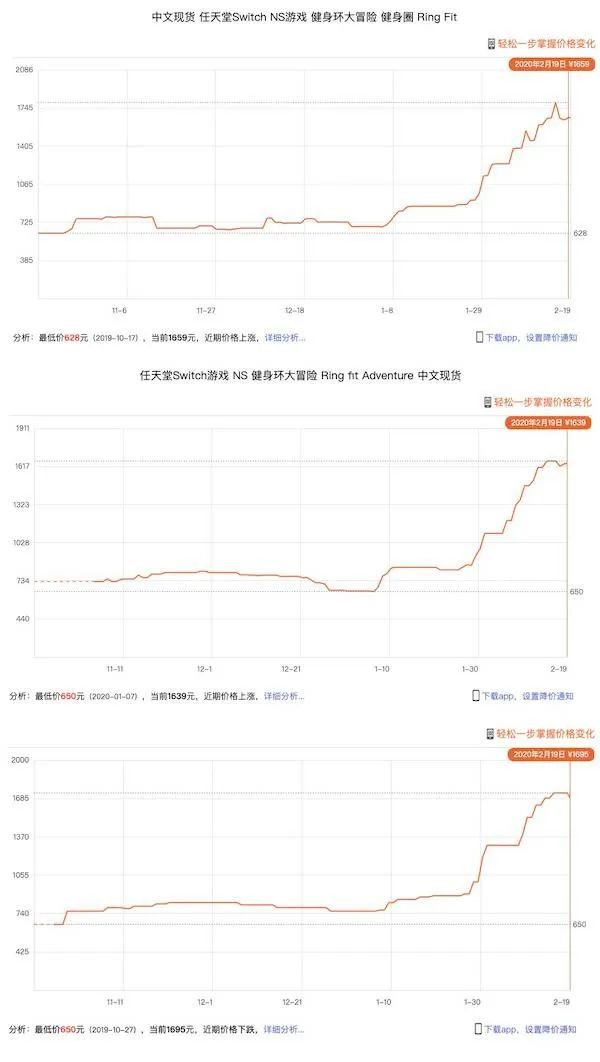 没想到的是,1 月底的疫情影响下,人们对于室内运动的需求也大幅增长,这间接带火了和健身相关的游戏。此时健身环出现了第二次涨价,且增长曲线更为明显,定价一路冲破 1600 元大关。