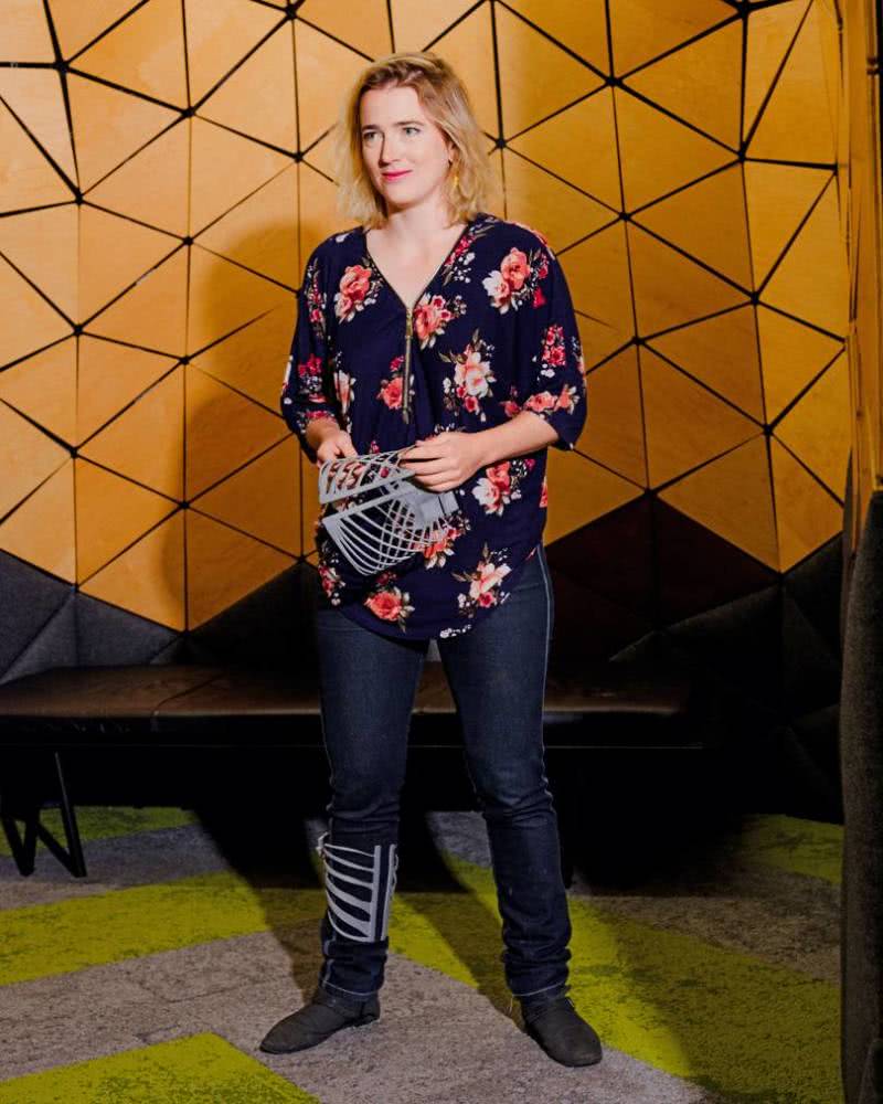 这条代号为“Smarty Pants”的裤子灵感受到最近软机器人技术进步的启发,也源自西兰自己与患有阿尔茨海默症的92岁祖母共同生活的经历。在西兰祖母那样的高龄,即使是像站立这样简单的动作也会变得愈发困难。西兰表示,“如果你帮助他们做哪怕一件事,他们一天能多走30%的路。他们步行的时间越长,其他健康问题就越少。”她一条腿上穿着看起来像是3d打印的盔甲,上面连接着传感器,走路时传感器会收集步态数据。