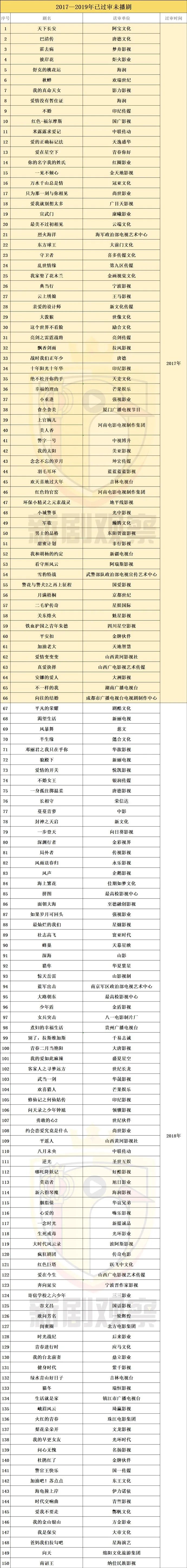 统计发现,2017——2018年取得发行许可证、至今未播出剧目150部,其中,2017年已过审至今未播出剧目共66部,包括古装剧《天下长安》《巴清传》《霍去病》,以及都市情感剧《舒克的桃花运》《彼岸花》《爱情没有暂住证》《我的真命天女》《爱的正确标记法》《爱在星空下》等。