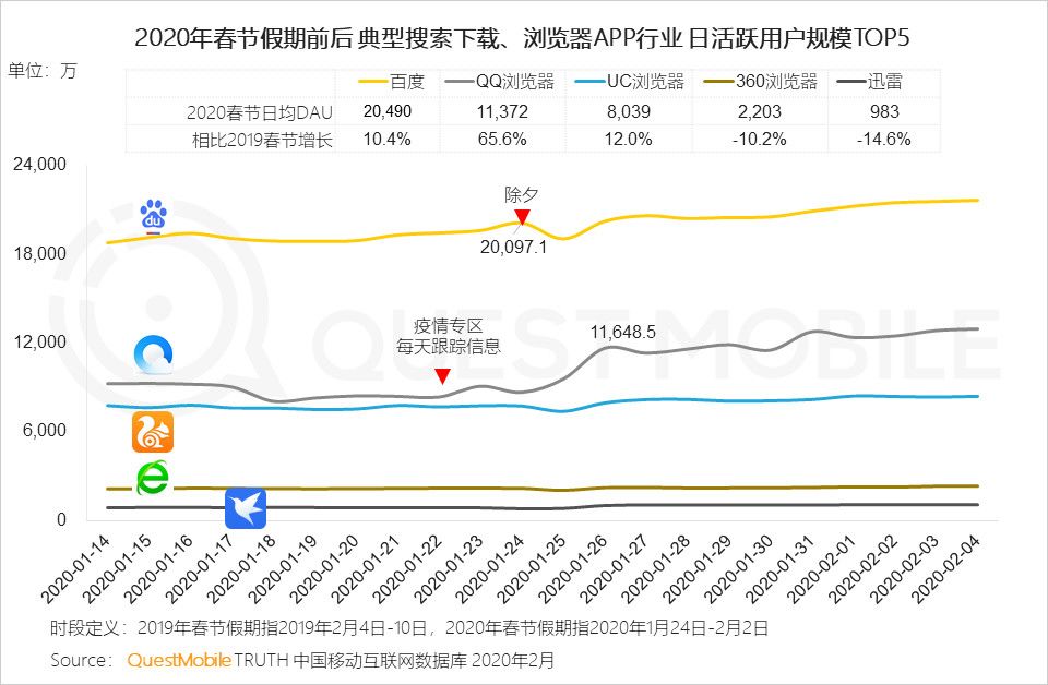 第二个,用户最多的时间是在内容上。用户会在线买菜、会在线问诊以获取必需服务,但最多的时间花在哪里了?答案是内容。QM数据显示,春节期间视频、游戏两大领域时长占比上涨至38%,其中短视频的时长占比超过手机游戏;新闻资讯行业用户规模增幅达到17.2%,使用时长创新高,因为人们要看疫情、防护等信息。比如,百度APP在疫情期间活跃用户规模和使用时长同步上涨,相比2019年百度春晚红包期间,其日均日活用户增长了10.4%达2.05亿,成为疫情期间最为活跃的App之一。可见,人们要获取信息,有很多问题想要在网上得到答案。