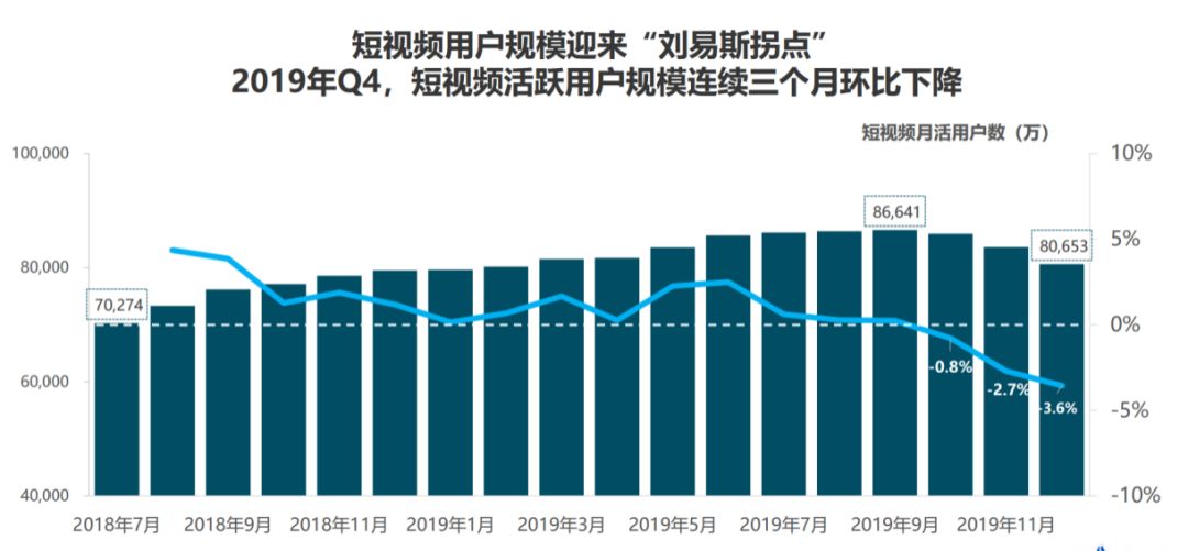 短视频赛道经历了数年的用户增长,如今用户已经趋于饱和,2019年Q4的活跃用户规模环比下降,用户规模的“刘易斯拐点”出现。赛道竞争格局方面,快手和抖音两大巨头的格局也已经逐渐形成,并稳定下来,用户越来越习惯同时下载两个APP。