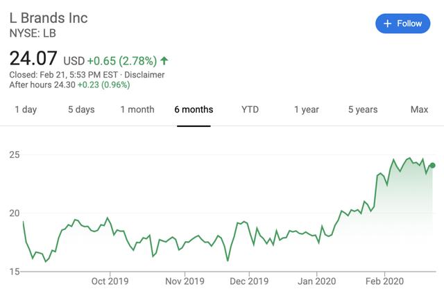 市场对于这次交易的反应也较为积极:自从L Brands要出售维秘的消息传出后,L Brands的股价就一路上扬,目前已经来到了近6个月的高位。