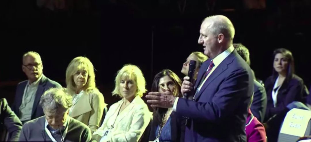 随后,灯光照亮主席台下方的主嘉宾席位,格雷格起身回答问题。