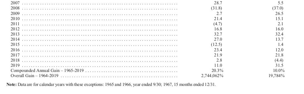 虽然这十年他遭遇诟病,但年信首页列出的历史成绩,仍令人惊叹。1965-2019年,伯克希尔的复合年增长率为20.3%,远超标普500指数的10.0%。