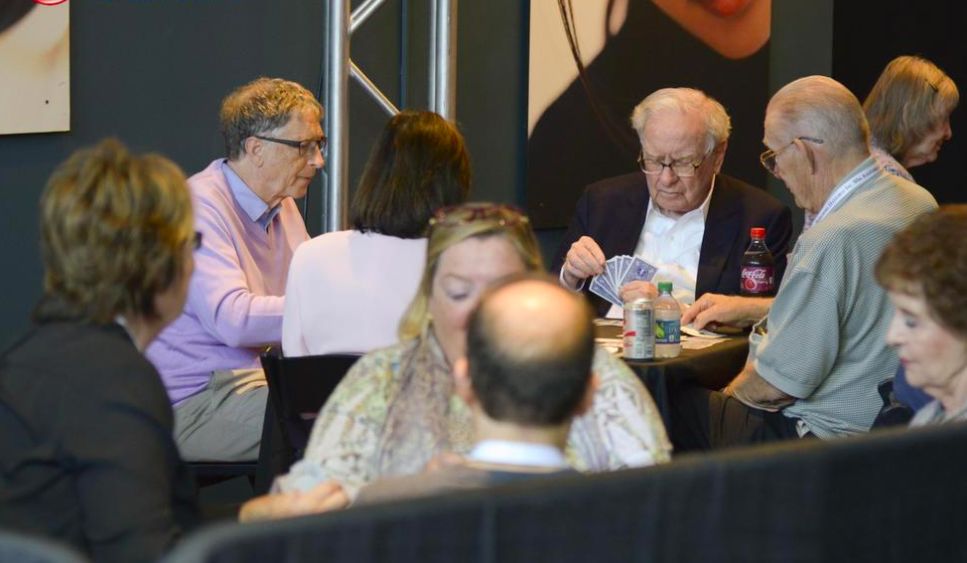 巴菲特和盖茨一同打桥牌,于2017年,摄影:丁晔。巴菲特的名言之一就是“如果牌过三巡,还不知道谁是傻瓜,那么,你就是那个傻瓜”。