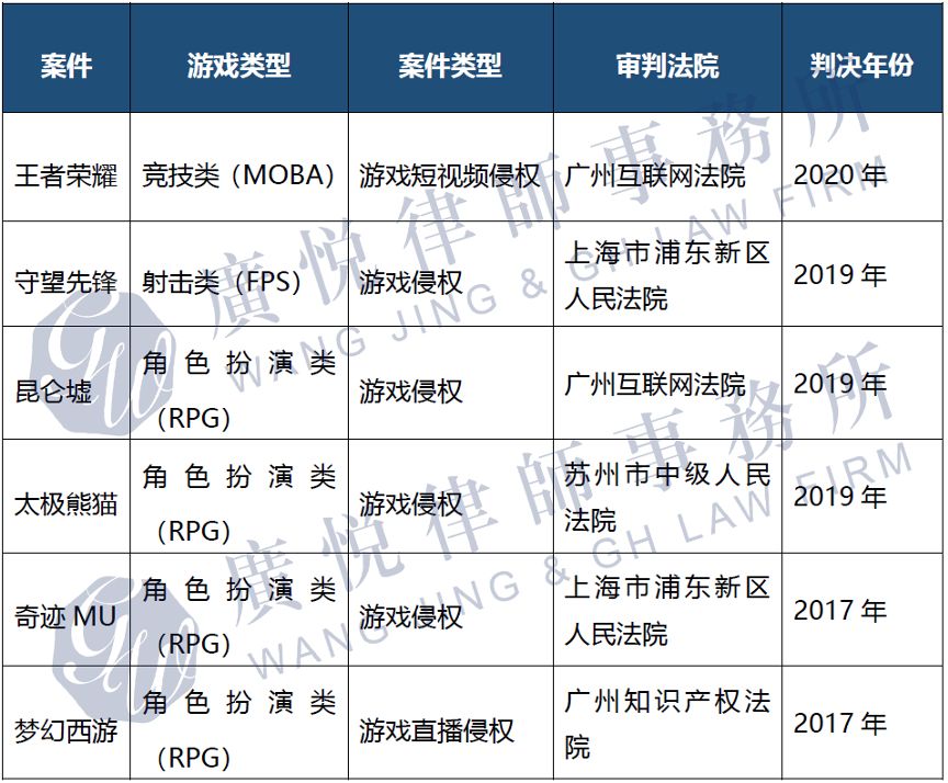 在广州互联网法院将《王者荣耀》认定为类电作品之前,已有司法实践将《奇迹MU》、《梦幻西游》、《守望先锋》、《太极熊猫》、《昆仑墟》等游戏认定为类电作品保护。我们整理了上述几个案件的情况: