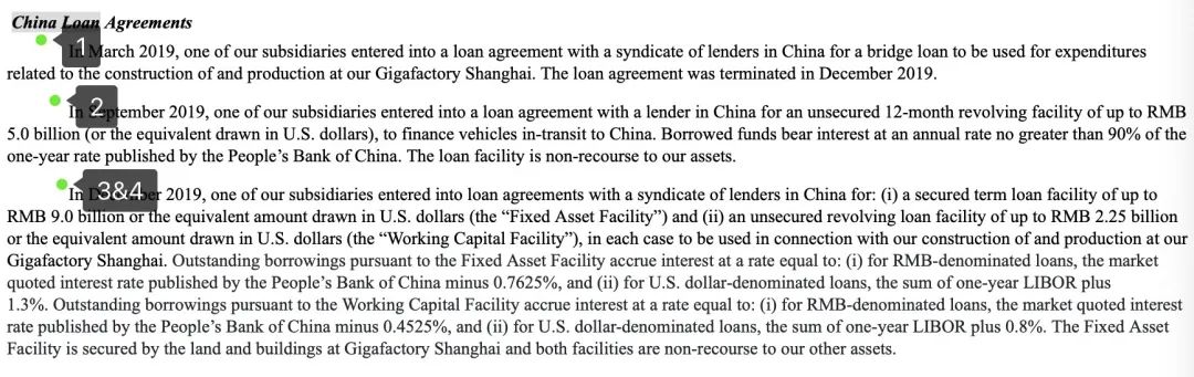 再比如12月的那两笔,利率也有不同程度的受惠。其中,22.5亿元那笔,又是无担保循环贷;90亿元那笔,需要担保,担保物则是上海工厂的土地和建筑。这两笔的贷款方,对特斯拉的其他资产都没有追索权。
