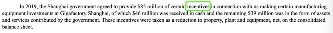 还有另一部分,是作为对工厂制造设备的投资,由上海政府向特斯拉提供的8500万美元(约合人民币6.00亿元)补贴激励。其中4600万美元(约合3.25亿元人民币)以现金到账,剩下3900万美元(约合2.75亿元人民币)则以资产和服务的形式落地。