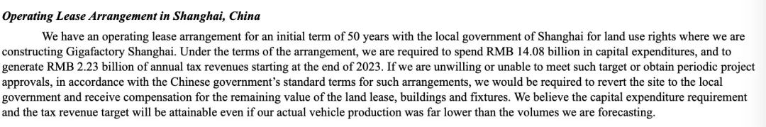 作为回报,特斯拉需要在五年内对该厂投资140.8亿,并每年缴纳22.3亿元的税金,从2023年年底开始。否则就得把地还回去。而如果在土地租赁、建筑、固定装置方面还有剩余价值,特斯拉则能收到补损。