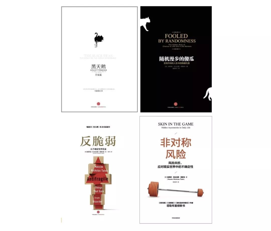 四本分别是《黑天鹅》《随机漫步的傻瓜》《反脆弱》《非对称风险》。