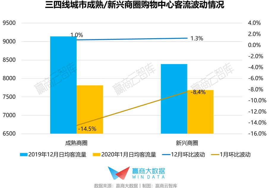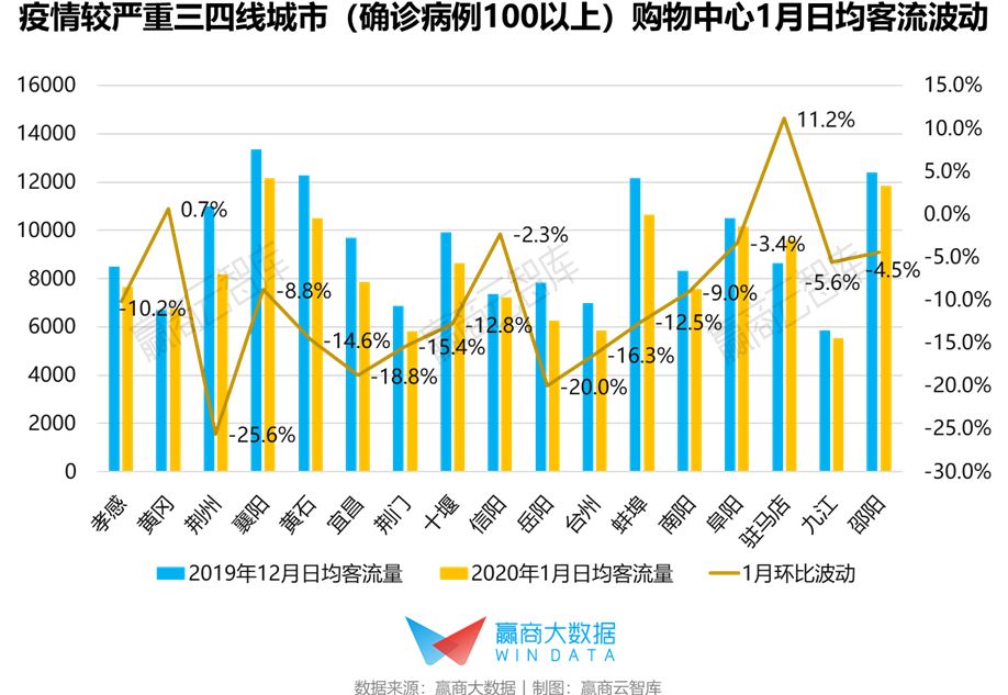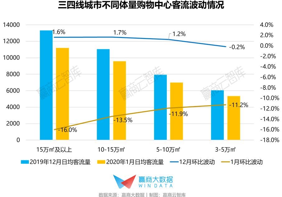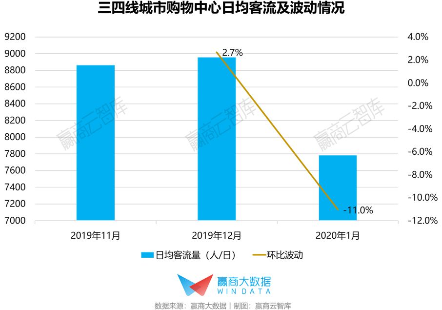 三四线城市购物中心客流波动:1月日均客流平均下降11%,客流下降明显与疫情严重城市重合度不高