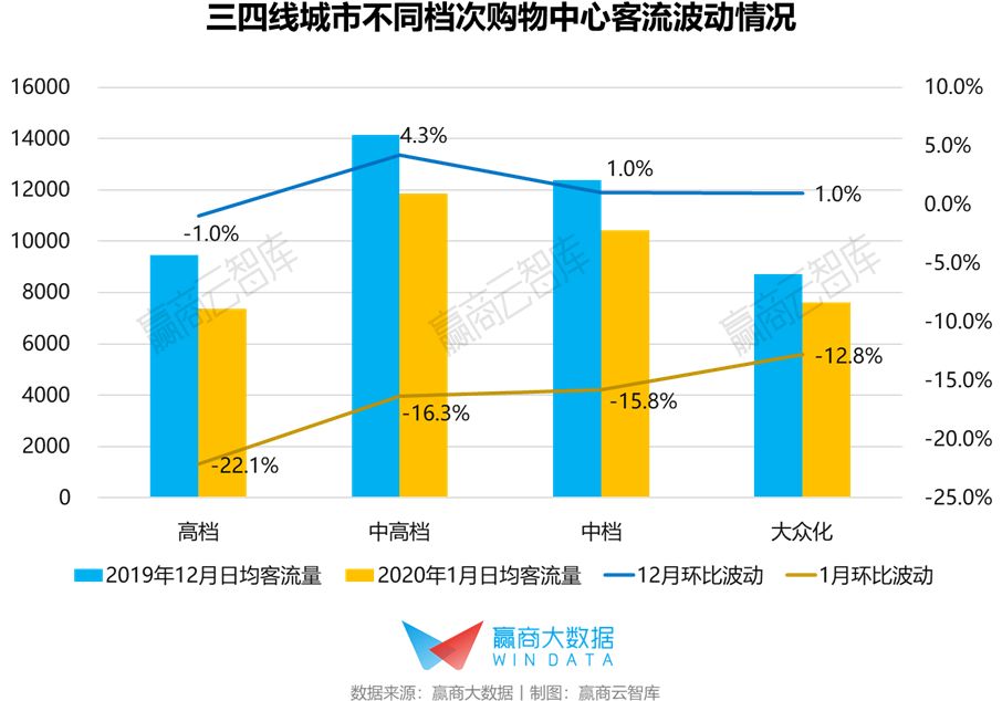 随着疫情的发酵,全国大部分企业、工厂停工,部分工薪阶层暂时失去收入来源,甚至失业,且这种情况在三四线城市更突出。市场购买力急剧下降,对越是昂贵的商品消费意欲越是低迷,而满足消费者日常生活所需的大众化购物中心受波及程度较小。