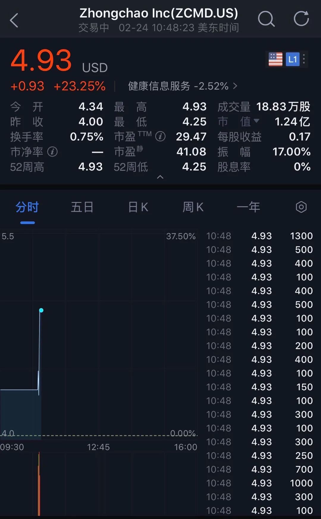 2月24日,众巢医学登陆纳斯达克。开盘后股价从4美元飙升至4.93美元,涨幅达到23.25%,公司市值为1.24亿美元。