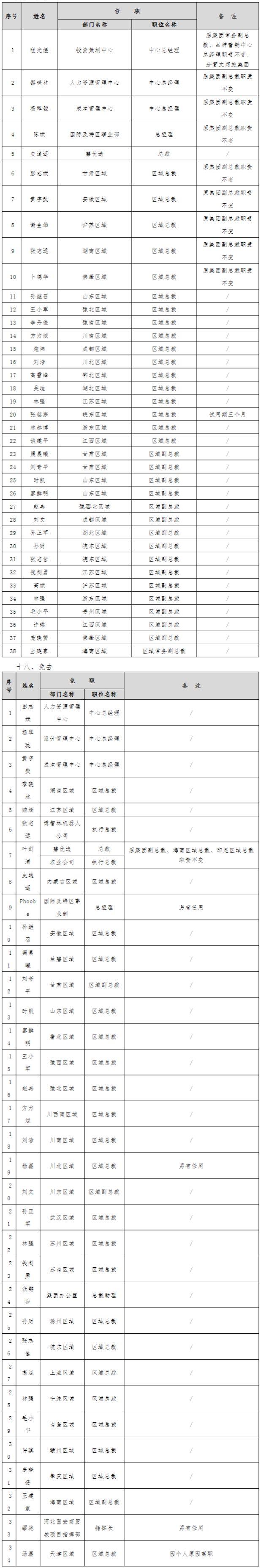 另一方面,则将原区域负责人调回总部职能部门:原湖南区域总裁黎晓林改任人力资源管理中心总经理;江苏区域总裁陈斌担任国际及特区事业部总经理,原集团副总裁职责不变。