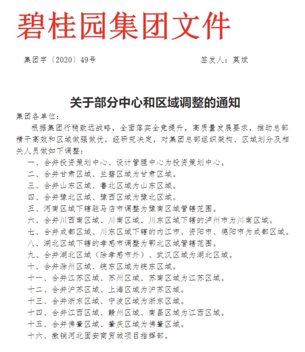 2月24日晚间,碧桂园公布了一份集团总裁莫斌签署的《关于部分中心和区域调整的通知》,正式宣告进行至少16项组织架构调整,对超过29个区域进行合并,以及38个总部与区域高管的任免。