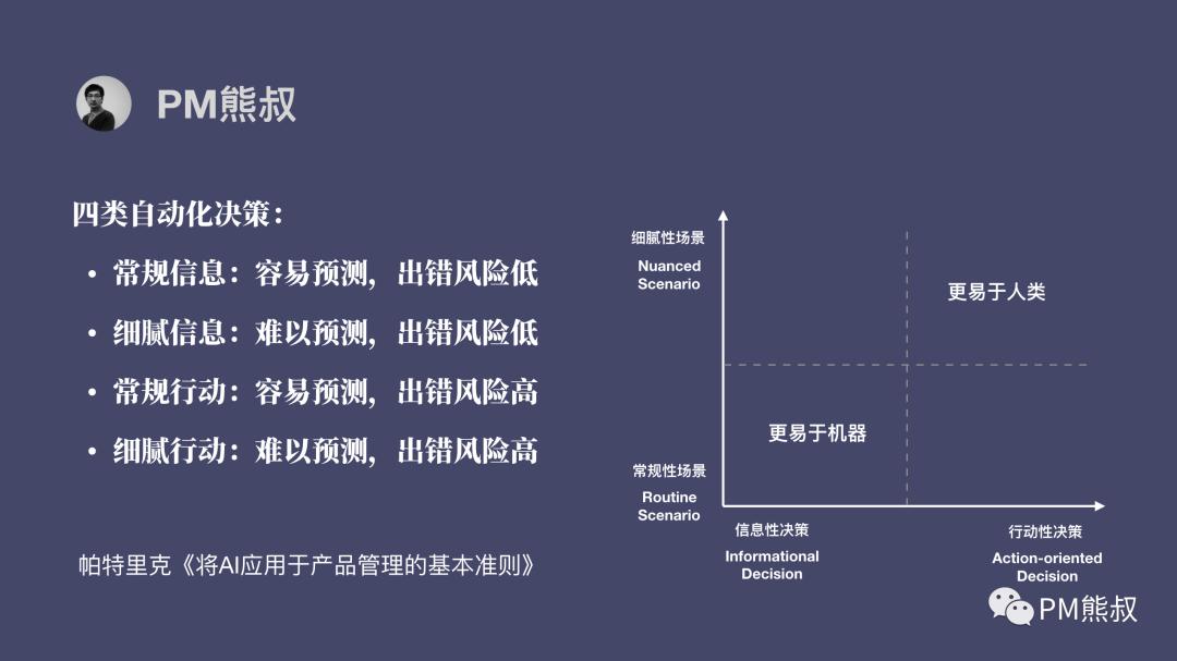 常规性场景+信息性决策:对细节要求不高,学习案例多,AI学习效果较好,AI只提供信息建议,辅助人类决策,出错的风险很低,特别适合AI来做;