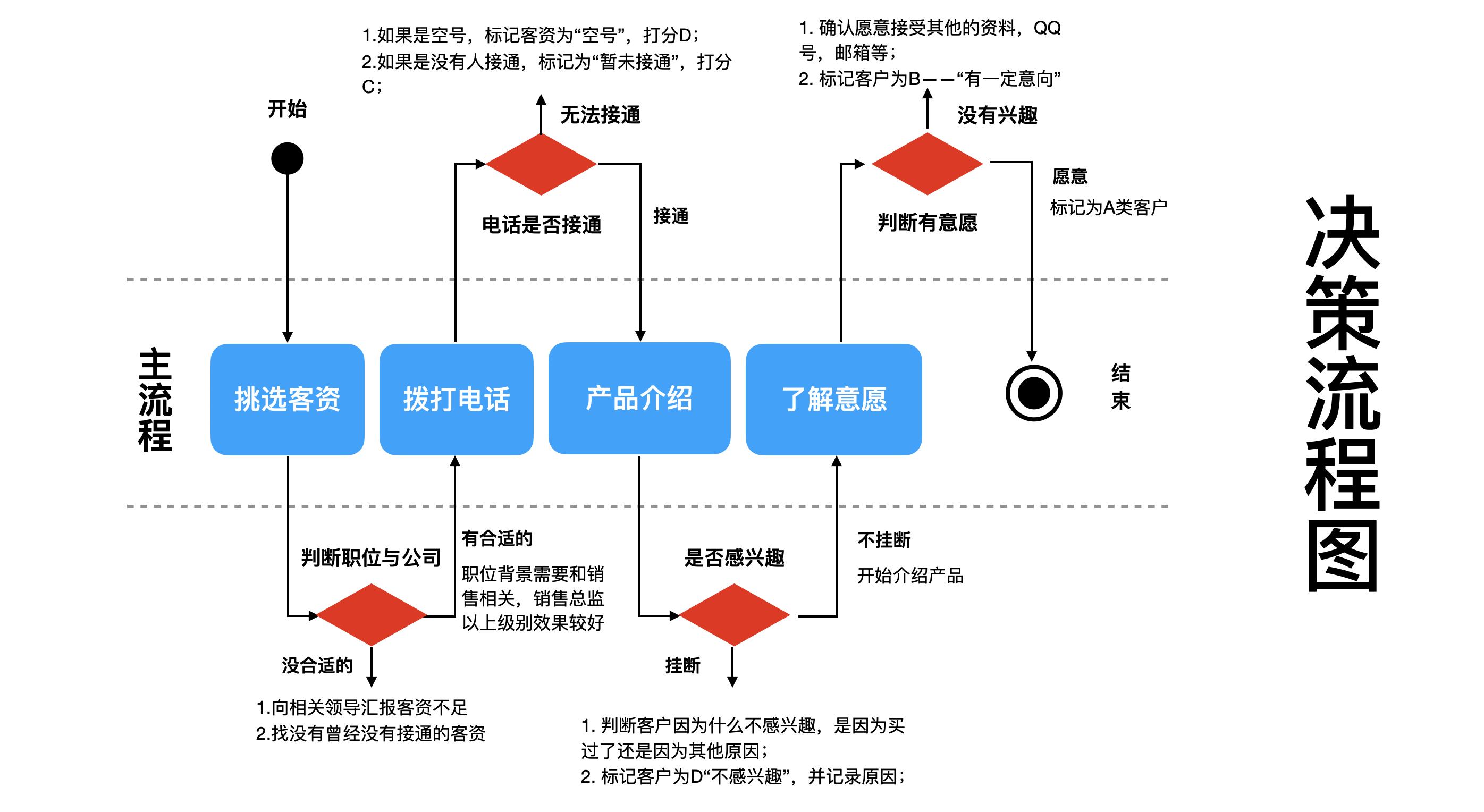 如图所示,起点是挑选客户资料,结束点是标记出有意愿的A类的客户。 为了更加明确,我们将主流程(Happy path)放到主轴上面,代表决策的菱形节点放在两边,我们可以一目了然,看到那些通向“幸福 Happy”的关键决策。