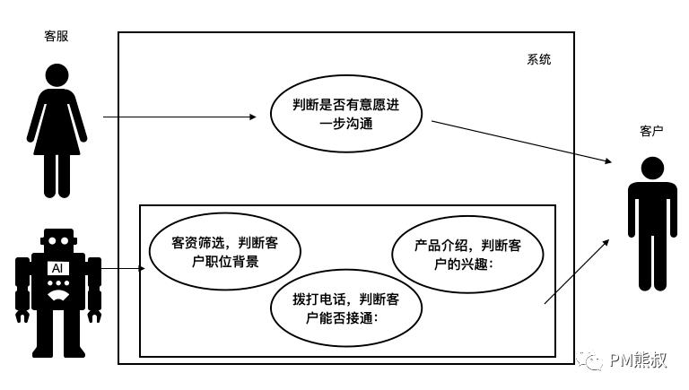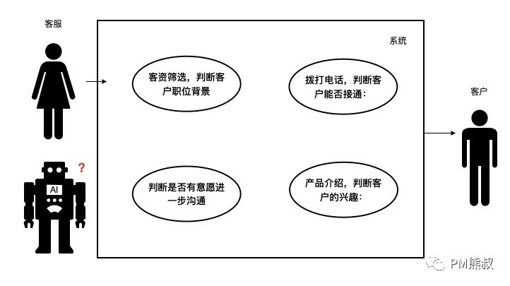 另外,我们还可以将此清单直观地整理成UML用例图,这个系统参与者有三个:客服,客户,AI。