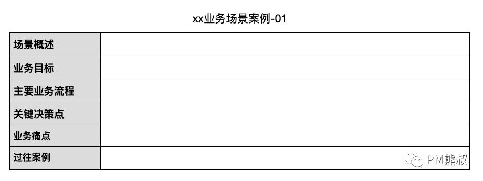 我们可以将收集的案例整理成一个个表格或者卡片,包含要素有:场景概述、业务目标、业务流程、关键决策点、业务痛点、过往案例: