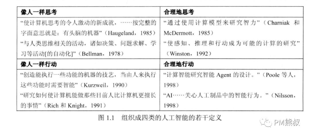 学术界对于AI智能已经有了一些定义,人们期望AI像人一样,能合理地思考和行动(出自《人工智能——一种现代化的方法》),如下图。
