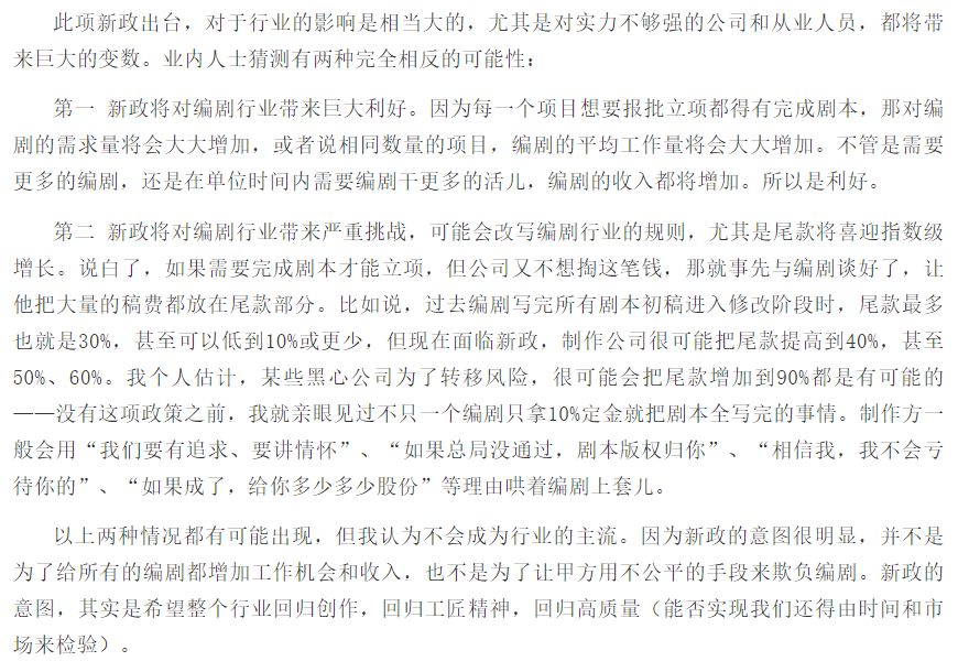 对此,余飞他在《“完成剧本承诺书”与“人狠话不多”》中提到,新政将对编剧行业带来严重挑战,可能会改写编剧行业的规则。这背后的原因,主要是尾款的比例会增长,从原来的不到30%大幅增长,从而使编剧的收入风险增加。