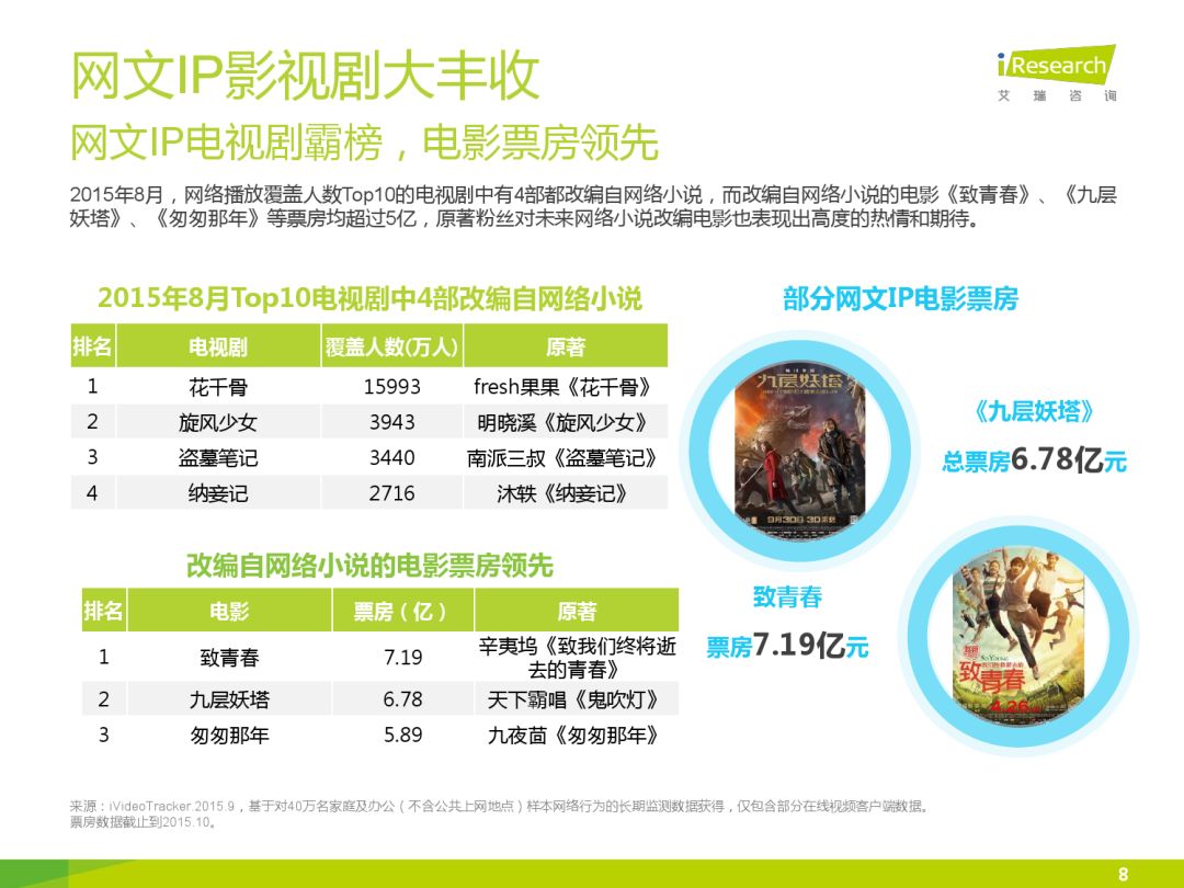 根据艾瑞咨询发布的《2015年中国网络文学IP价值研究报告》,仅是2015年8月份Top 10 电视剧当中,就有 4部改编自网络小说。那个夏天大火的《花千骨》,就是热门网络小说IP改编。