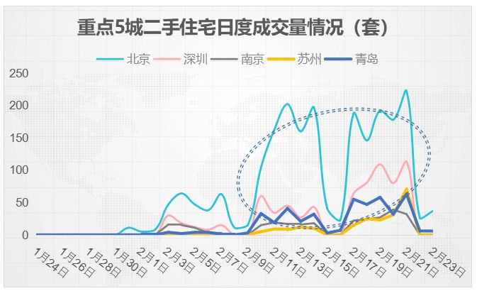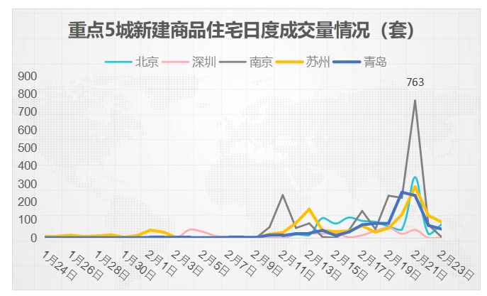 在春节叠加疫情双重因素影响下,为防范疫情的传播,各城市纷纷暂停售楼处,部分网签中心延迟复工,受其影响,新建商品住宅成交量接近于0。自2月10日即今年第6周开始,重点5城才开始有所成交,但成交量处于历史低位水平;第7周城市成交量逐步上涨,其中值得注意的是南京,2月21日南京新建商品住宅成交量763套,高于历史正常水平,虽然受网签备案延迟影响,但仍看出市场逐渐恢复活力。