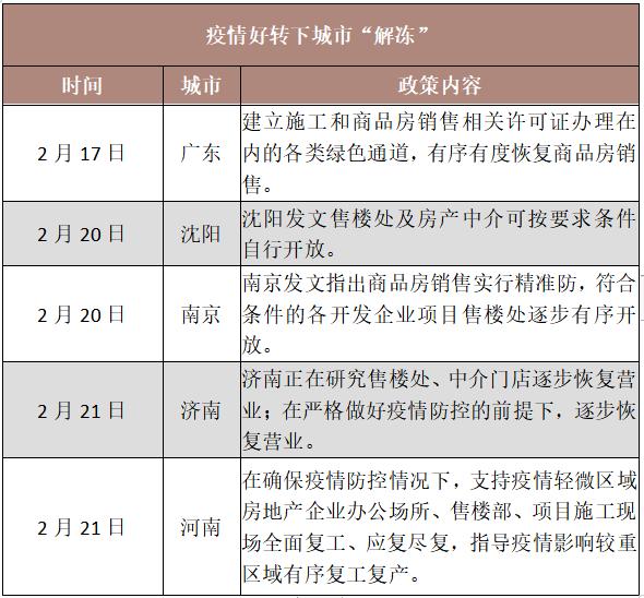 第三阶段:在各地积极有力的防控下,多地疫情得到有效的控制,新增确诊病例已连续多日为“0”,复工也逐渐提上日程,两省三市传来好消息,楼市逐步“解冻”。