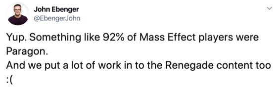 最近,曾经在Bioware担任过电影化设计师的John Ebenger就揭示了一个数据:“92%的《质量效应》玩家都选择了楷模路线,可我们开发团队其实也为叛逆路线的内容做了很多工作的呀……”