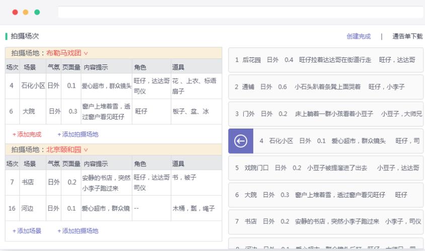 根据剧本解析的场景数据,服化道管理系统可自动展现拍摄地位置信息、所需置景信息以及对应道具服装信息,制片各部门可在软件中实现云端协同交流。